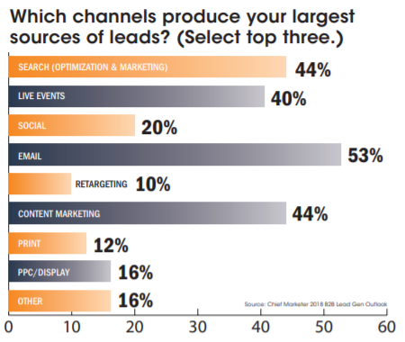 - I Chief Marketers B2B Lead Gen Outlook 2018 anger 44 % att sök (SEO + SEM) är den mest framgångsrika digitala kanalen att generera leads. 44 % anger också att sök har högst ROI.