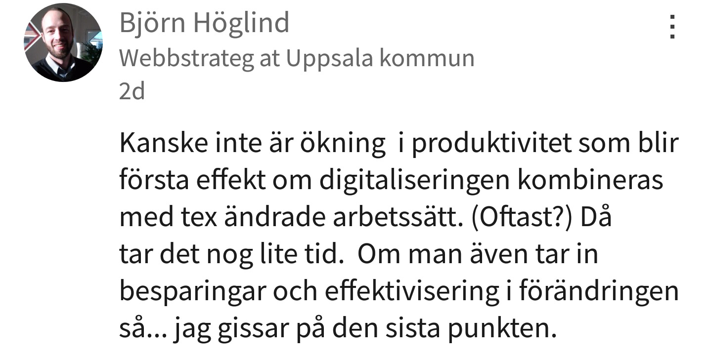 Många har läst mitt inlägg här på bloggen, på LinkedIn och i LinkedIn-gruppen Digitala strateger i Sverige om Swedbaken-ekonomen Anna Bremans presentation om att digitaliseringen inte har lett till någon produktivitetsökning i Sverige.