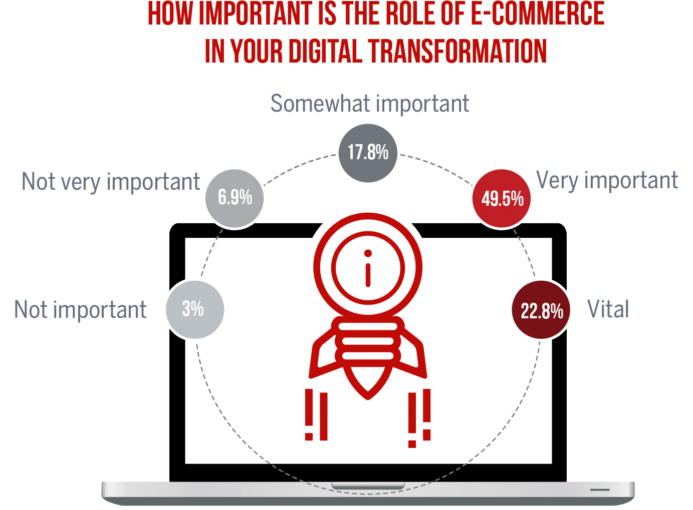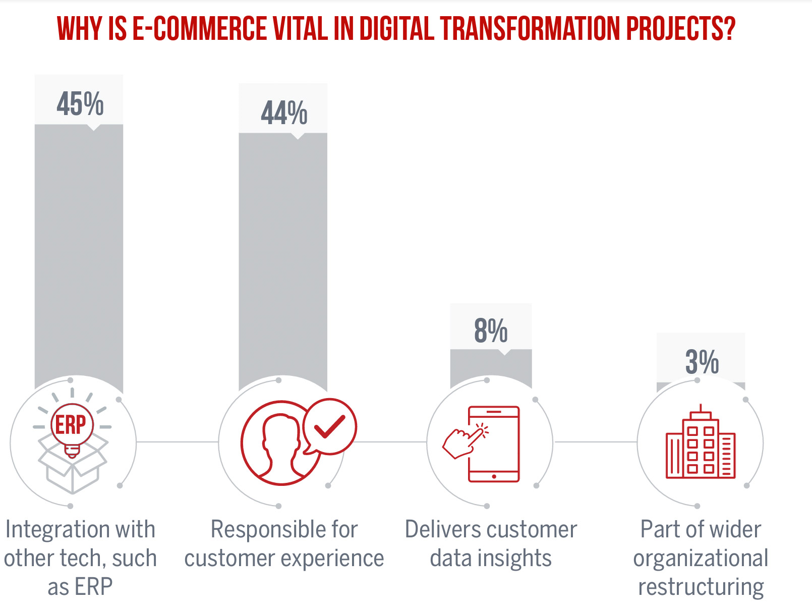 Den främsta anledningen till e-commerce är att e-handelsplattformen kan integreras med andra affärssystem som ERP (45 %) som gör att planeringsprocessen och sälj går hand i hand. Läs mer om / ladda ner rapporten Digital Transformation and B2B E-Commerce Report 2017-18