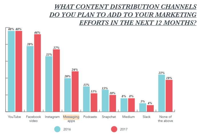 I Hubspots State of Inbound 2017 angav 24 % av de tillfrågade B2B-företagen att de kommer att lägga mer krut på meddelandetjänster de närmaste 12 månaderna. Därtill skulle man kunna lägga på Snapchat (10%), Slack (4 %), Medium och delar av Facebook och Instagram.