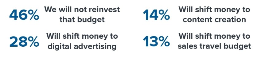 46 % svarade att de inte tänker återinvestera pengarna till annat. 28 % skiftar budget till digital marknadsföring medan 14 % satsar på content marketing.