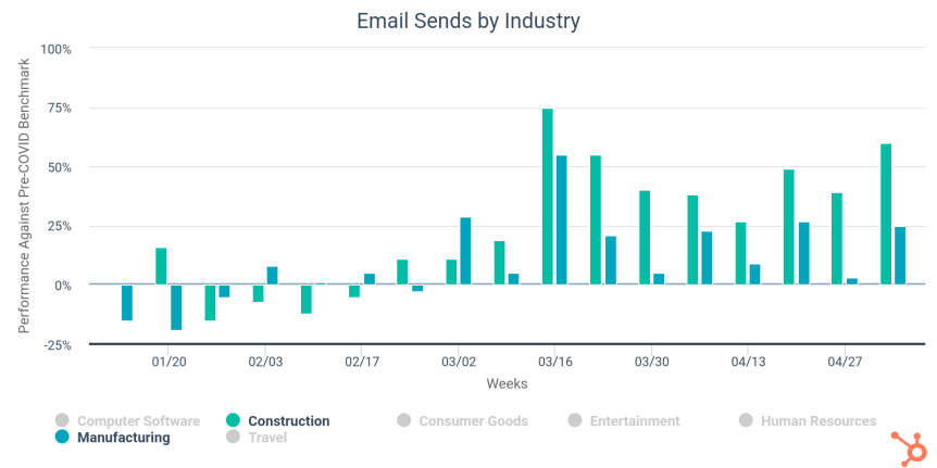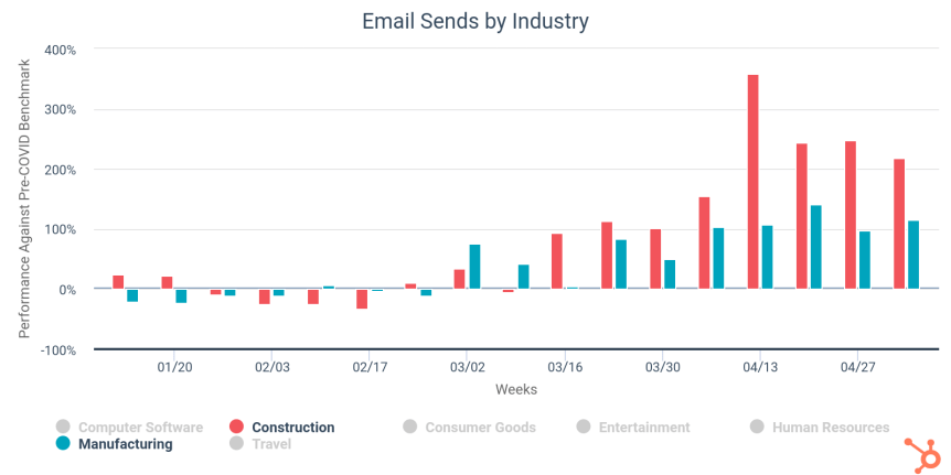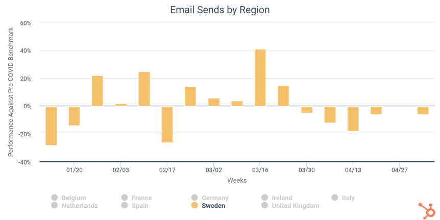 Hubspot har samlat data från över 70.000 kunder för att kolla hur covid-19 påverkar deras sälj- & marknadsaktiviteter respektive -resultat i kundkanalerna e-mail och webb.